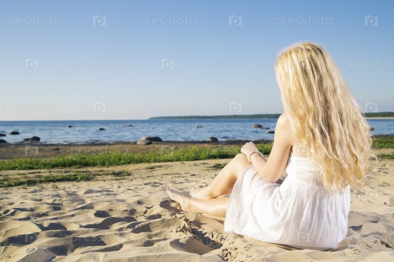 Женщина в белом платье смотрит на закат
