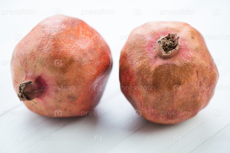 Два спелых граната на белых деревянных досках