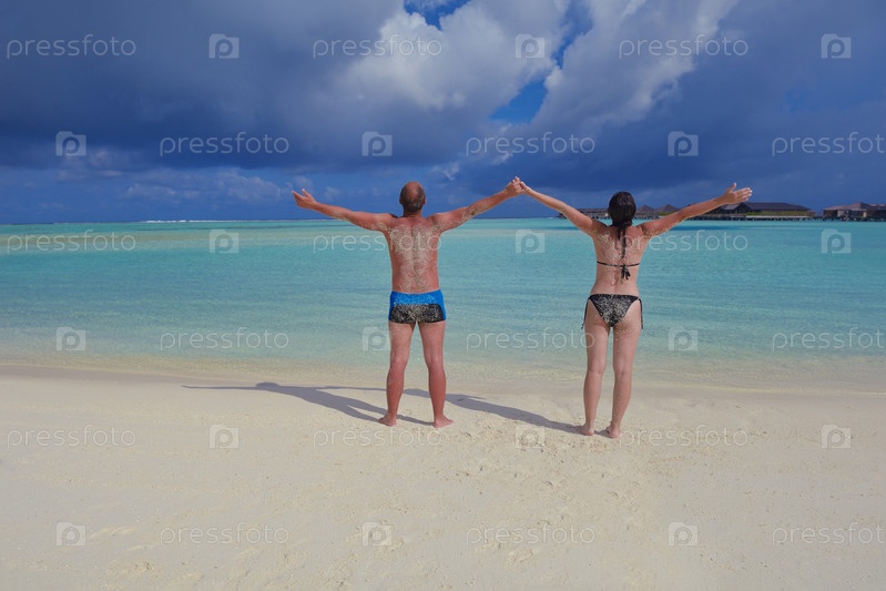 Счастливая молодая пара весело проводит время на летних каникулах на пляже