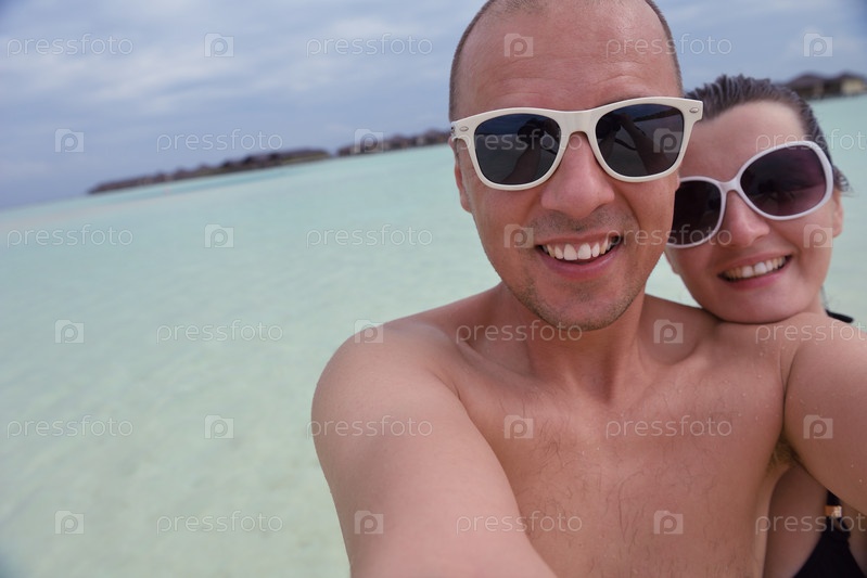 Счастливая молодая пара весело проводит время на летних каникулах на пляже