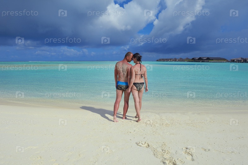 Счастливая молодая пара весело проводит время на летних каникулах на пляже