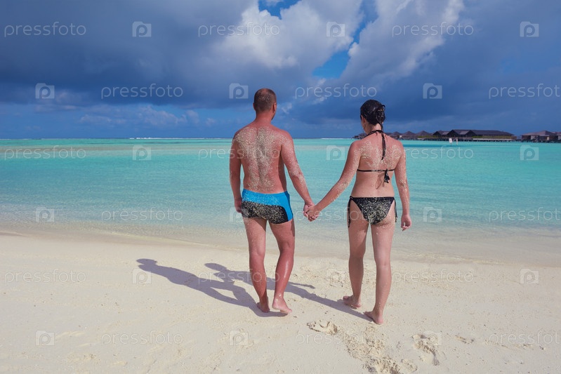Счастливая молодая пара весело проводит время на летних каникулах на пляже