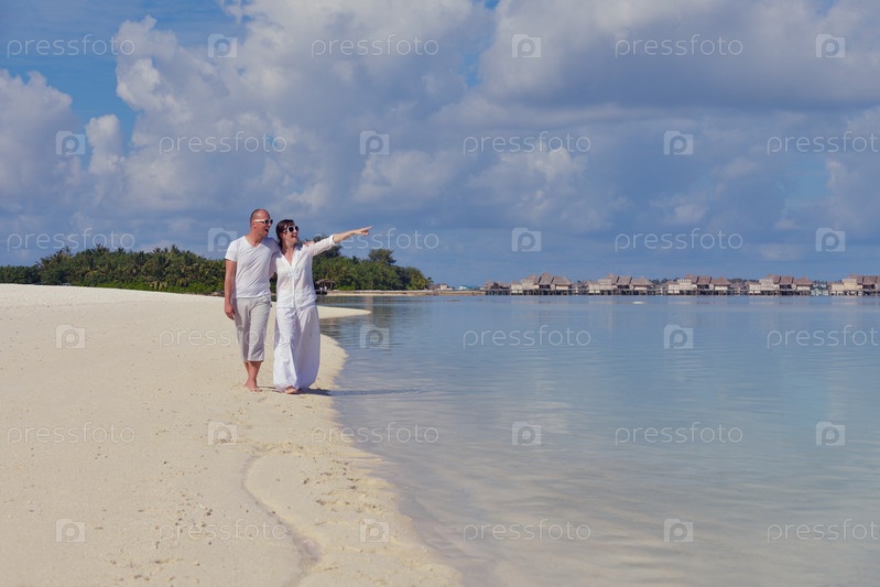 Счастливая молодая пара на летних каникулах весело проводит время и отдыхает на пляже