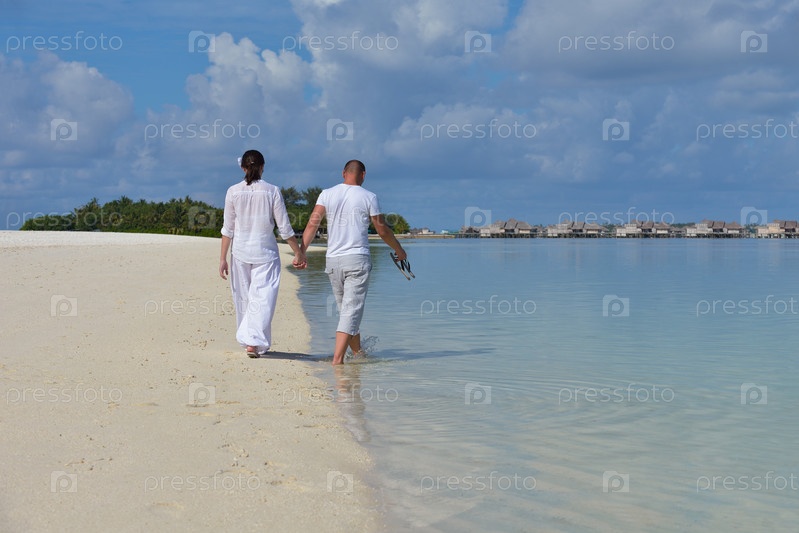 Счастливая молодая пара на летних каникулах весело проводит время и отдыхает на пляже