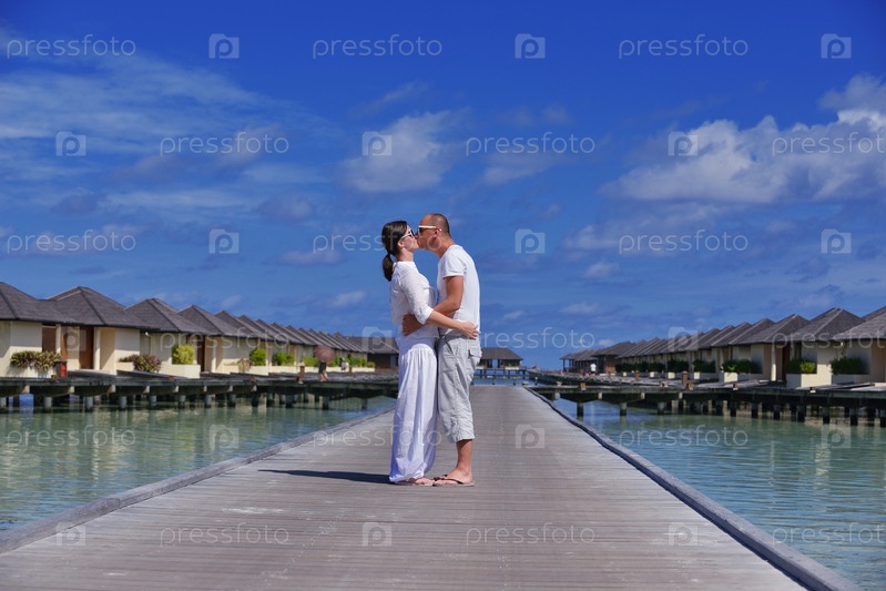 Счастливая молодая пара на летних каникулах весело проводит время и отдыхает на пляже