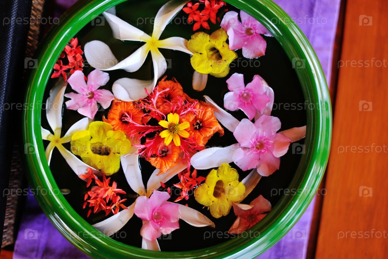 Миска воды с красивыми цветами в качестве фона