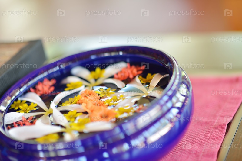 Миска воды с красивыми цветами в качестве фона