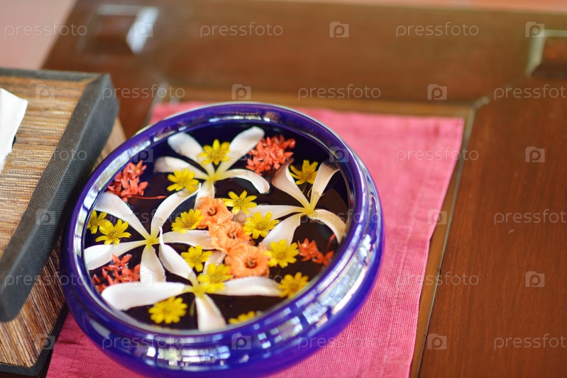 Миска воды с красивыми цветами в качестве фона