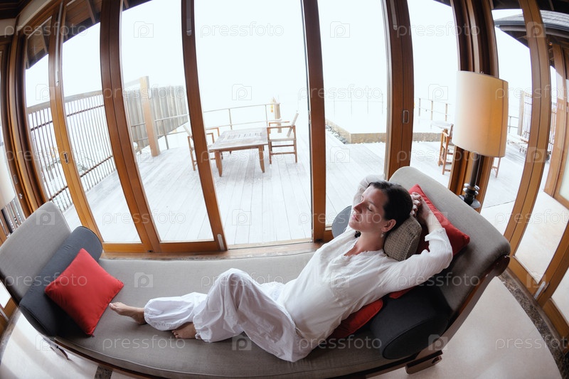 Счастливая молодая женщина отдыхает у себя дома на диване