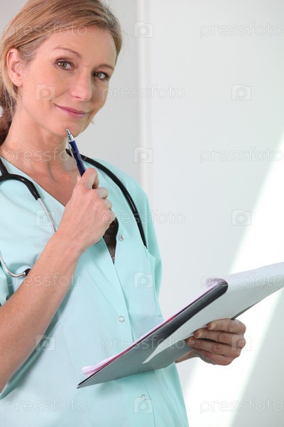 Улыбающаяся медсестра смотрит на заметки