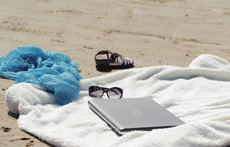 Ноутбук, шарф и полотенце на пляже