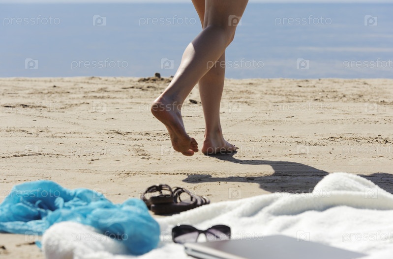 Ноутбук, шарф и полотенце на пляже