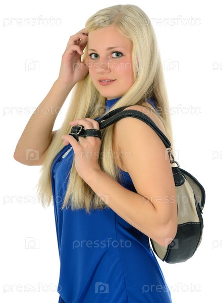 Девушка с сумкой смотрит в камеру, изолированная на белом фоне