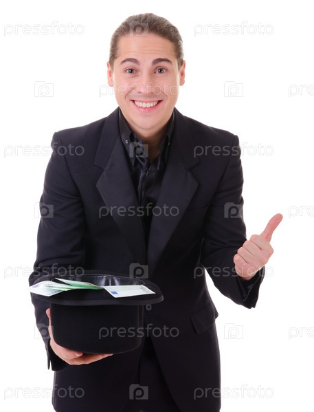 Человек достает деньги из шляпы