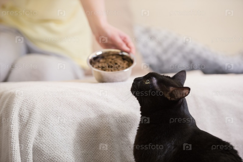 Женщина кормит черную кошку в доме