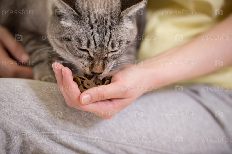 Женщина кормит пятнистую кошку в доме