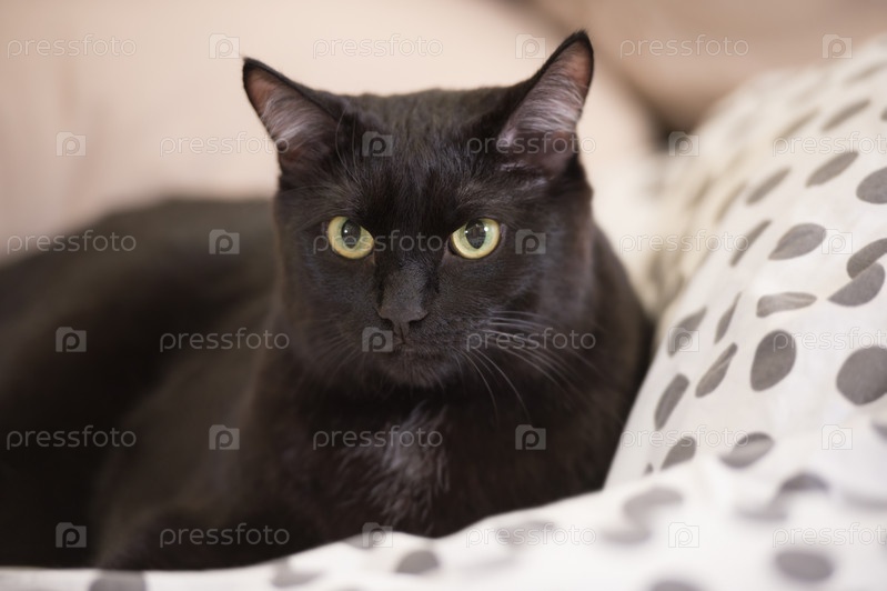 Ленивый большой черный кот лежит на кровати