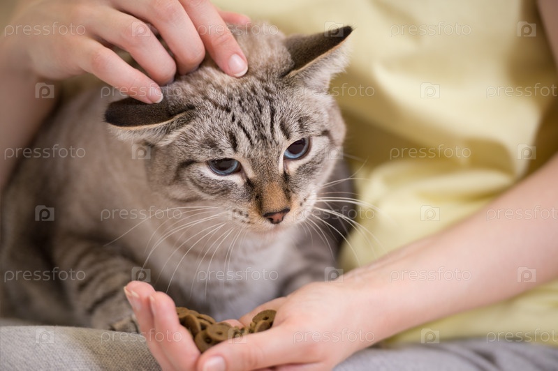 Женщина кормит пятнистую кошку в доме