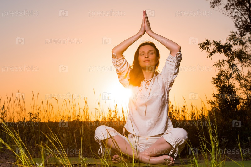 Женщина занимается йогой на закате