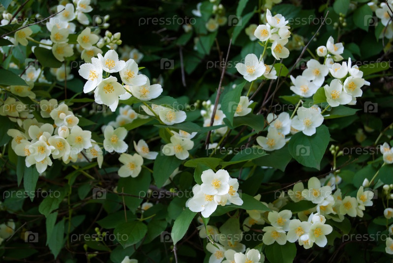 Цветки жасмина и зеленые листья