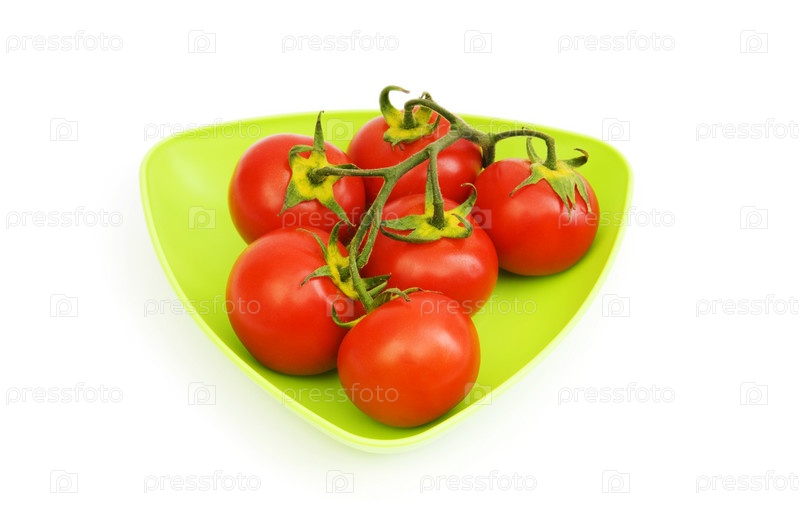 Спелые помидоры на ветке в тарелке, изолировано на белом фоне