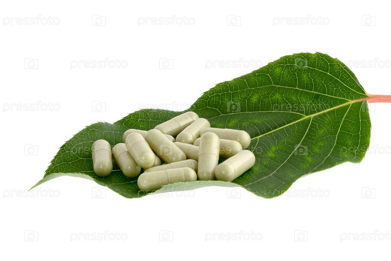 Таблетки на зеленом листе, изолированные на белом фоне