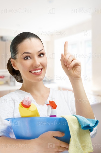 Молодая девушка с набором моющих средств
