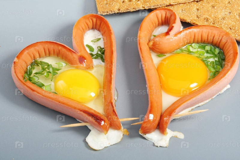 Две сосиски на яичнице в форме сердец