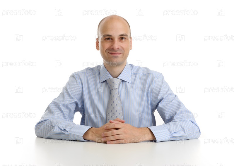 Улыбающийся бизнесмен сидит за столом, изолированный на белом фоне