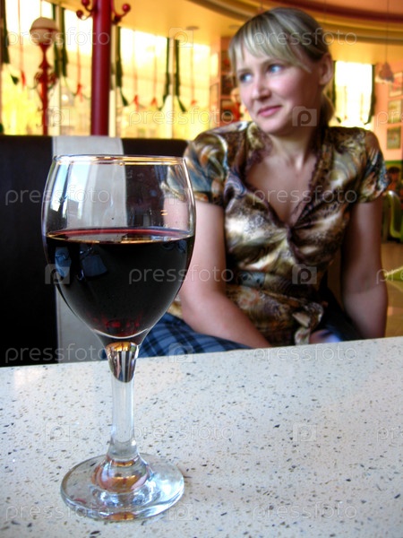 Стакан красного вина на столе и девушка