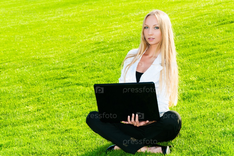Деловая женщина сидит на траве