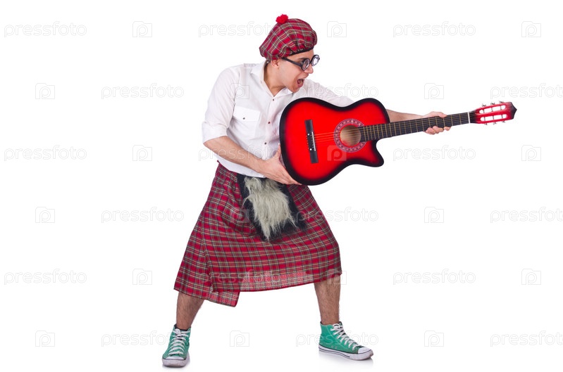 Смешной шотландец с гитарой на белом фоне