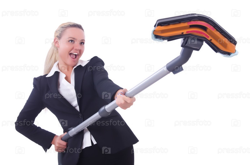 Бизнес-леди с пылесосом на белом фоне