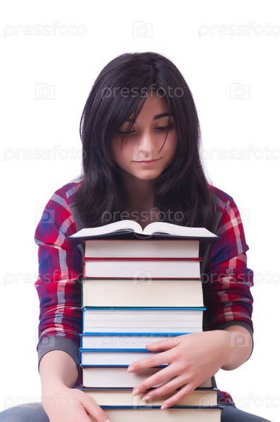 Студентка с книгами на белом фоне