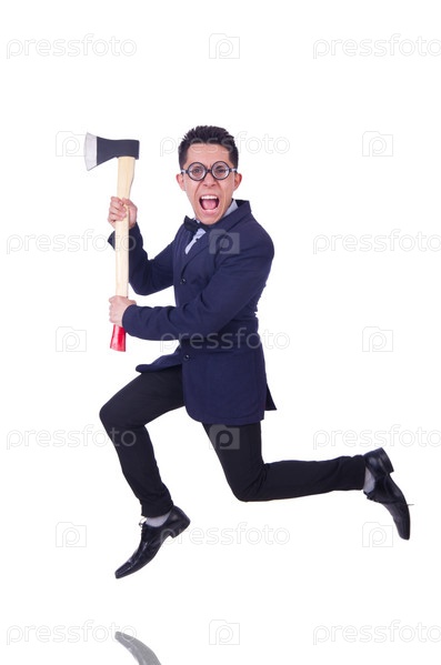 Забавный мужчина с топором на белом