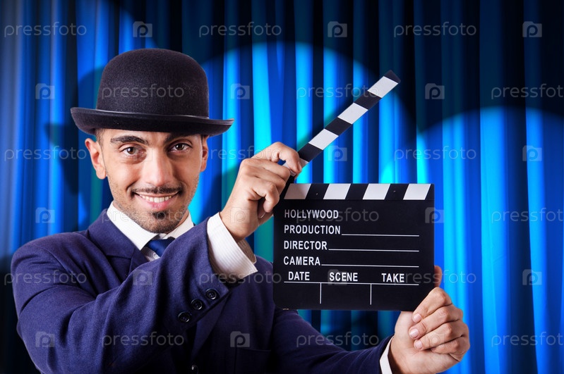 Мужчина с хлопушкой на фоне занавеса