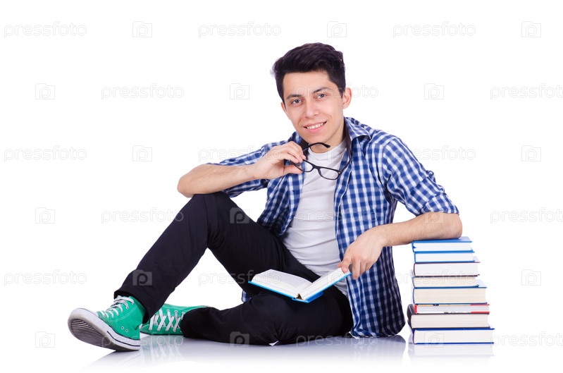 Студент с большим количеством книг на белом фоне