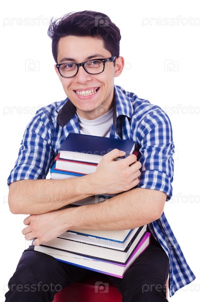Студент с большим количеством книг на белом