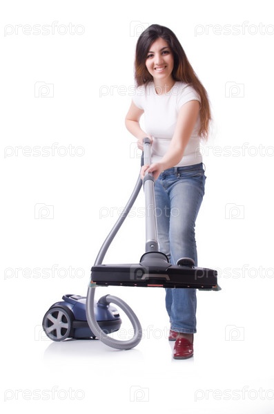 Молодая женщина с пылесосом на белом фоне