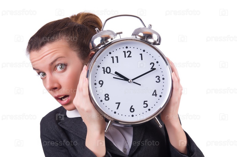 Женщина с гигантскими часами на белом фоне