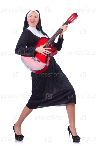 Монахиня играет на гитаре, изолированная на белом фоне