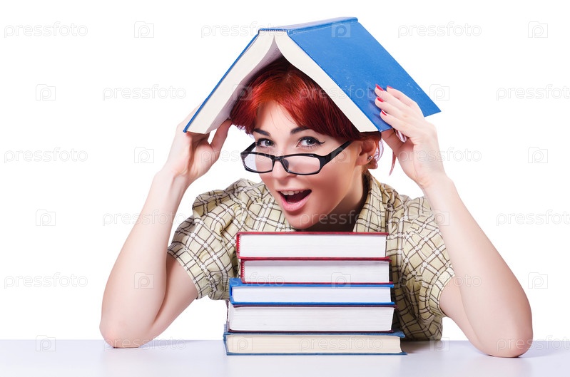 Студентка с книгами на белом фоне