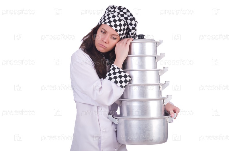 Повар со стопкой кастрюль на белом фоне