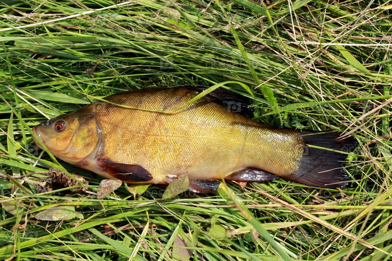 Большой линь лежит в траве