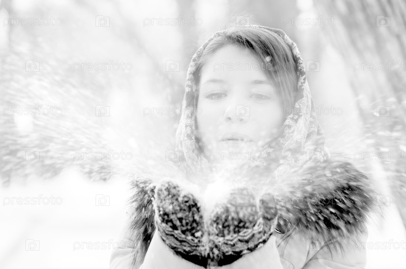 Женщина дует снег