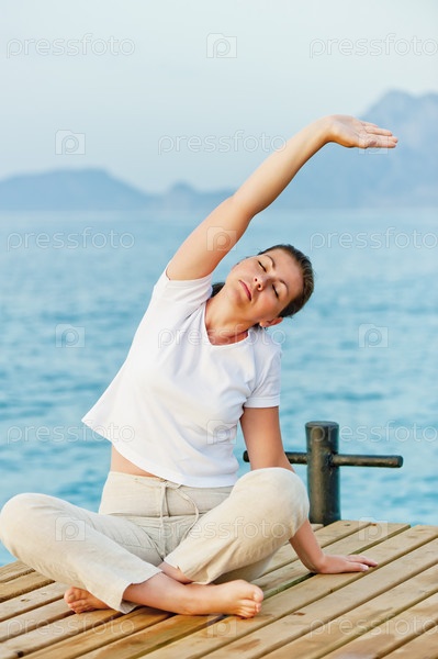 Молодая женщина занимается пилатесом на море