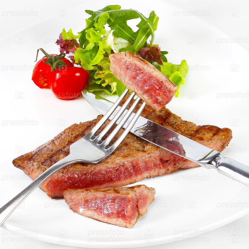 Жареный бифштекс с овощами на белом фоне