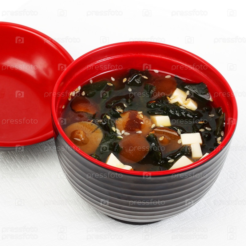 Грибной суп с картофелем и рисой в ярко-красной миске