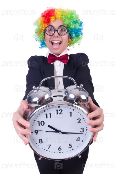 Забавный клоун с часами на белом фоне