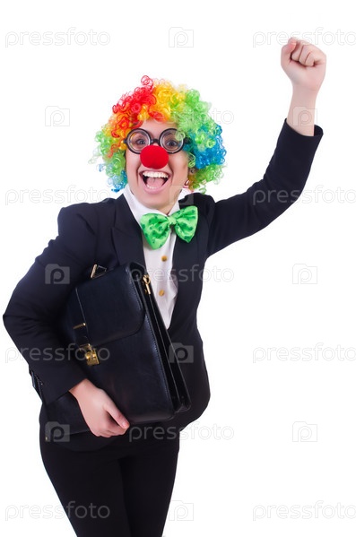 Деловая женщина - клоун, изолированная на белом фоне